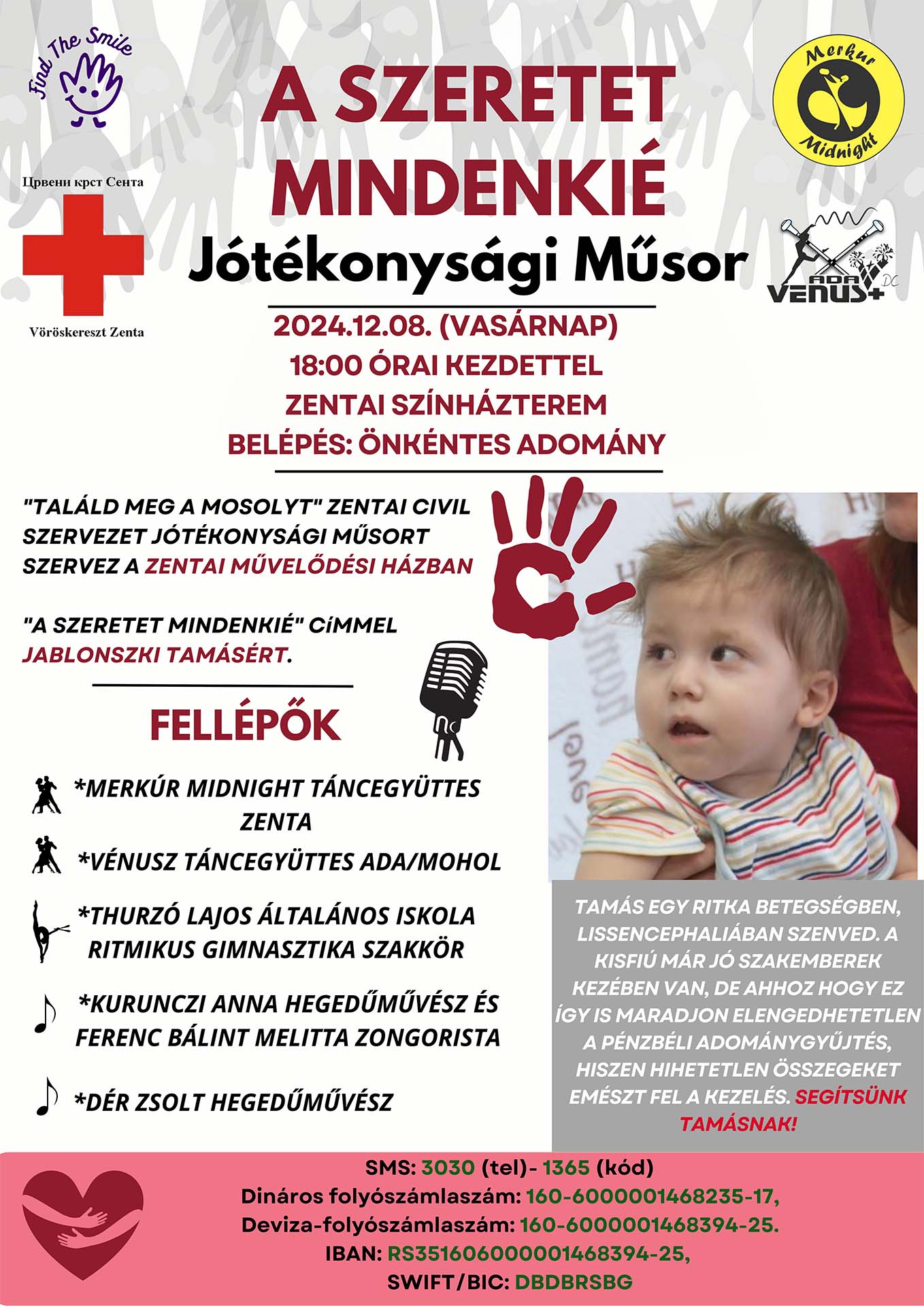 A Találd meg a Mosolyt és a Vöröskereszt zentai szervezete egy jótékonysági koncertet szervezett „A Szeretet Mindenkié” címmel, a Zentai Művelődési Házban.